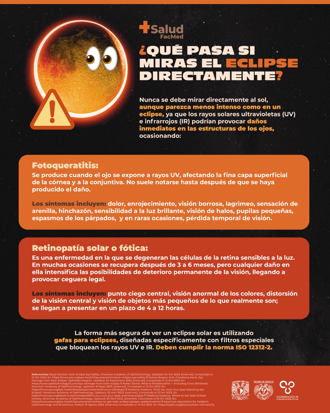 A diferencia de los eclipses solares, en los que mirar directamente al Sol sin protección puede causar daños severos a la retina, la luz reflejada por la Luna durante un eclipse lunar no contiene los rayos ultravioleta (UV) que son dañinos para los ojos.